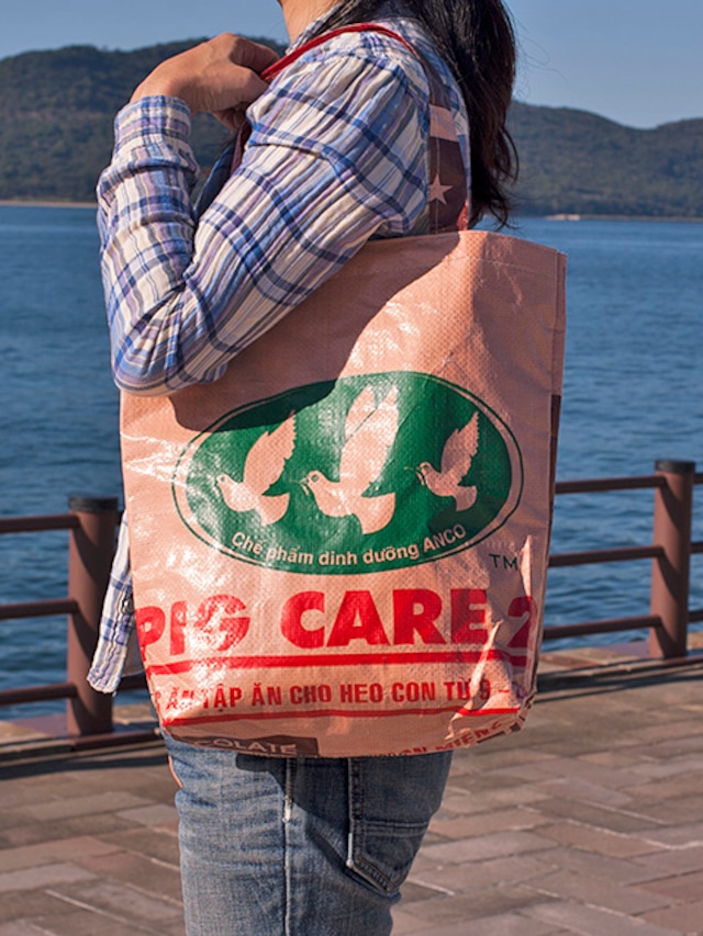 A4サイズの書類が優に入る大きさのバッグです。 プールバッグやスパバッグとしてもおすすめです。 ハト用飼料の袋(未使用品)で作られています。 本体サイズ:約370(W)×100(D)×380(H)mm 持ち手高さ:約220mm 裏地付き 中にファスナー付きポケット ◆サイゴン・キッチュとは ホーチミン市のトンタットティエップ通りにあるオリジナル雑貨を製造販売しているお店です。 オーナー兼デザイナーのフランス人ミシェルさんがベトナムらしいデザインにフランスっぽいテイストを効かせた各種雑貨は雑貨好きな観光客に大人気のようで、大人買いされる方が多いそうです。 当店での取り扱いはバッグ類のみですが、他にもキャンドルやマウスパッドやノート、アクセサリー等ありとあらゆるアイテムが揃っています。 ベトナムに行かれる際には、是非お立ち寄りください。 女性へのおみやげ選びには最適なお店です。 カルディで初夏に開催されるベトナムフェアで扱っているサイゴンバッグの本家はこのブランドです。 ※サイゴン(ホーチミン)はおおらかなお土地柄の所為か、タグが付いていなかったり、ファスナーの向きが商品ごとに違っていたり、仕上げが荒かったりする場合がございますが、それも含めての味わいとご了承ください。 #サイゴンバッグ #サイゴンキッチュ