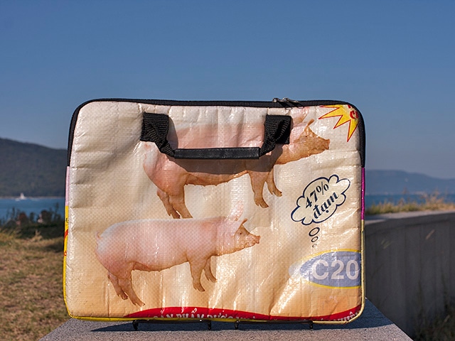 13inchのノートPC用のケースですが、クラッチバッグっぽくお使いいただいても面白そうです。 ブタの飼料用袋(未使用品)で作られていますが、ちょっとリアル過ぎなような…。 本体サイズ:約350(W)×20(D)×265(H)mm クッション裏地付き ◆サイゴン・キッチュとは ホーチミン市のトンタットティエップ通りにあるオリジナル雑貨を製造販売しているお店です。 オーナー兼デザイナーのフランス人ミシェルさんがベトナムらしいデザインにフランスっぽいテイストを効かせた各種雑貨は雑貨好きな観光客に大人気のようで、大人買いされる方が多いそうです。 当店での取り扱いはバッグ類のみですが、他にもキャンドルやマウスパッドやノート、アクセサリー等ありとあらゆるアイテムが揃っています。 ベトナムに行かれる際には、是非お立ち寄りください。 女性へのおみやげ選びには最適なお店です。 ※サイゴン(ホーチミン)はおおらかなお土地柄の所為か、タグが付いていなかったり、ファスナーの向きが商品ごとに違っていたり、仕上げが荒かったりする場合がございますが、それも含めての味わいとご了承ください。